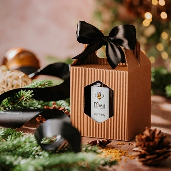 Dowolny Miód w czarnym pudełku z kokardką w kolorze ciemnego złota
