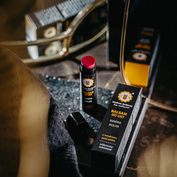 - Odżywczo – ochronny balsam do ust z woskiem pszczelim z efektem koloru na ustach.