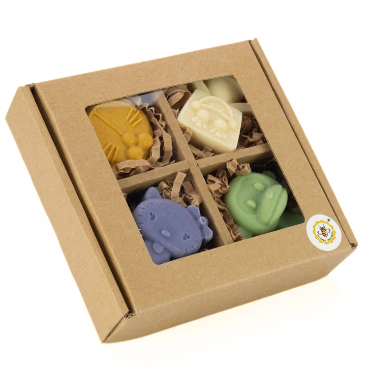 Mydła zapakowane są w tekturowe pudełko wypełnione wiórkami papierowymi. Pięknie się prezentują – polecamy je jako zestaw prezentowy dla dziecka na różne okazje.