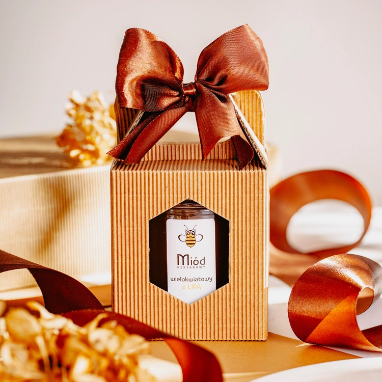 Wyjątkowy prezent dla każdego miłośnika naturalnych smaków - eleganckie pudełko z wybranym przez Ciebie miodem. Estetyczna brązowa kokardka nadaje całości szlachetnego charakteru, podkreślając wyjątkowość upominku.