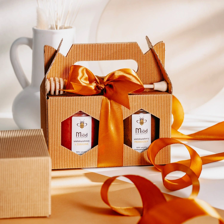 - Elegancki duet dwóch wybranych miodów z drewnianym nabierakiem zapakowany w box prezentowy z rączką, z satynową kokardką w kolorze ciemnego złota – prezent, który łączy naturalną słodycz z wykwintną formą i praktycznością użytkowania.