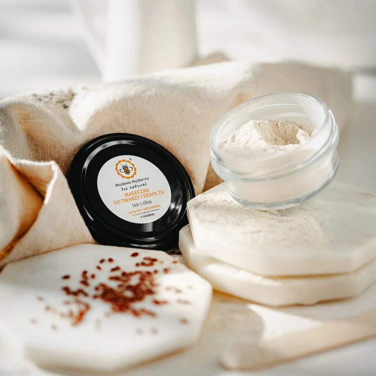 - Łagodząca i intensywnie regenerująca maseczka do twarzy, szyi i dekoltu z siemieniem lnianym, nasionami chia, glinką białą i rumiankiem, wzbogacona nawilżającym i super odżywczym miodem i pyłkiem pszczelim.