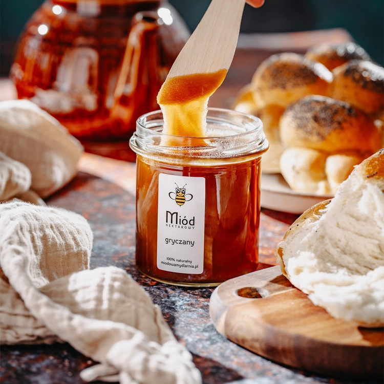 Miód gryczany wyróżnia się głęboką, ciemnobrunatną barwą oraz intensywnym, lekko korzennym smakiem, który może się różnić w zależności od regionu zbioru. Pszczoły produkują go z nektaru kwiatów gryki, które kwitną od lipca do sierpnia, co sprawia, że jest to produkt sezonowy. W Polsce, gdzie pszczelarstwo ma długą tradycję, miód gryczany z polskich pasiek cieszy się dużym uznaniem ze względu na swoją wysoką jakość i naturalne pochodzenie. Jego bogaty skład sprawia, że chętnie wybierają go osoby dbające o zdrową dietę.