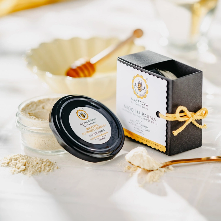 - Odżywczo-wygładzająca mleczna maseczka z miodem, pyłkiem pszczelim i kurkumą z dodatkiem mączki owsianej i cynamonu.