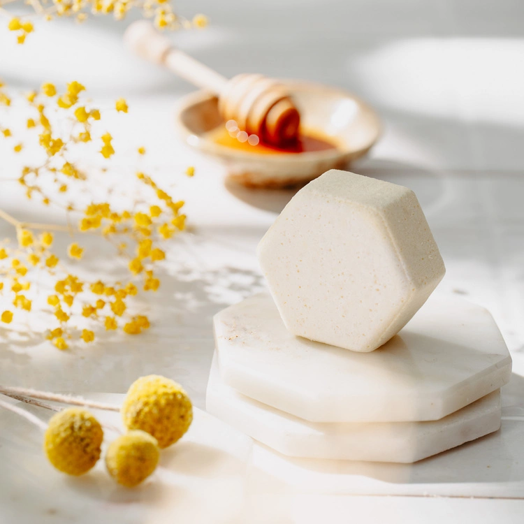 - Musująca, aromatyczna kula do kąpieli, w formie heksagonu, nawilżająca, z odżywczymi i kojącymi: miodem, mlekiem, mączką ziemniaczaną, masłami shea i z mango oraz olejem z rokitnika.