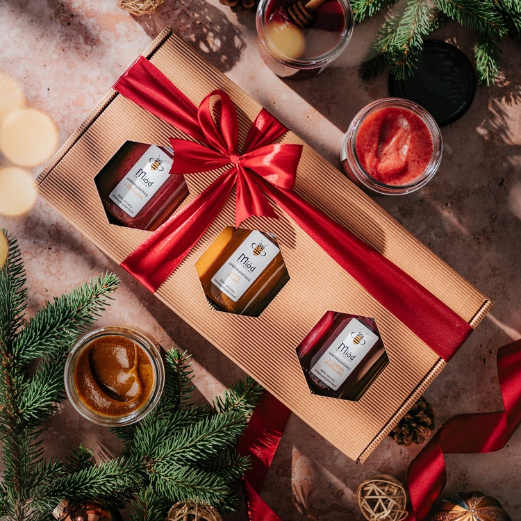 • Zestaw 3 miodów w pudełku prezentowym z okienkami i kokardką — wybierz klasyczne, owocowe lub korzenne profile, a my spakujemy je bezpiecznie i „na prezent”.