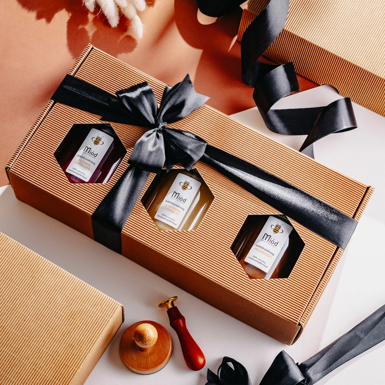 - Zestaw 3 miodów w pudełku prezentowym z okienkami i kokardką — wybierz klasyczne, owocowe lub korzenne profile, a my spakujemy je bezpiecznie i „na prezent”.