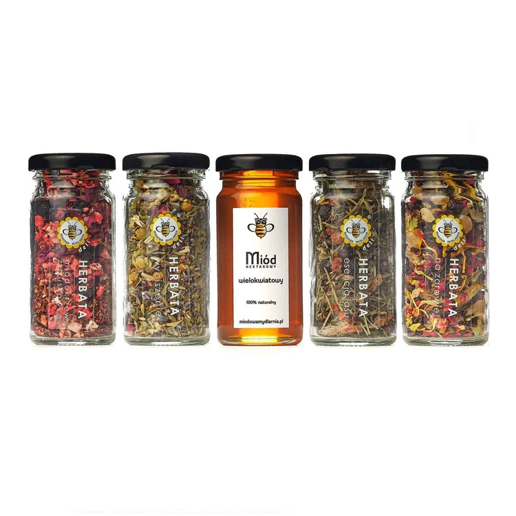 - Zestaw 4 rodzajów herbat i miodu. Naturalne, pyszne, zdrowe herbaty, bez dodatku jakichkolwiek sztucznych aromatów. Po zaparzeniu wydają naturalny aromat użytych w danej herbacie składników.
