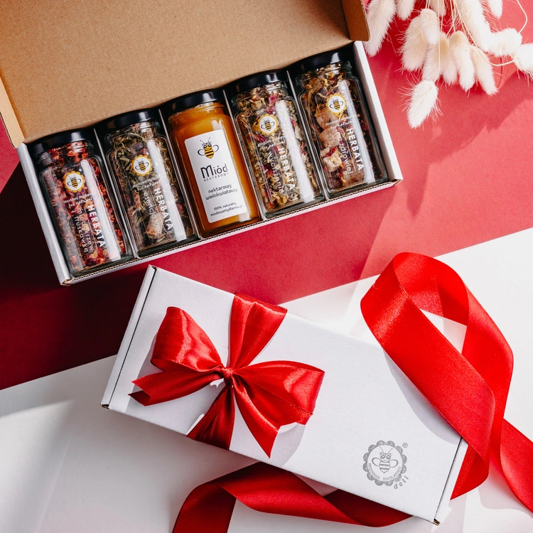 - Wyjątkowy komplet czterech naturalnych herbat ziołowych z polskim miodem wielokwiatowym, zapakowany w eleganckie białe pudełko ozdobione efektowną czerwoną kokardą. Idealna kompozycja na prezent dla kogoś wyjątkowego: