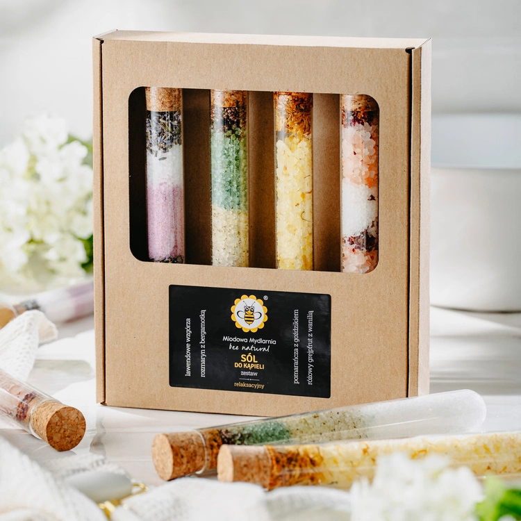 Fiolki z solami prezentują się uroczo i bardzo ciekawie, zapakowane są w estetyczne pudełko – jest to idealna propozycja na miły i oryginalny prezent dla wielbiciela kąpieli i relaksu w wannie.