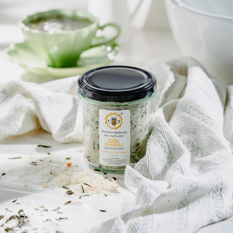 - Relaksacyjna sól do kąpieli bogata w minerały i przyjemny, świeży aromat zielonej herbaty.